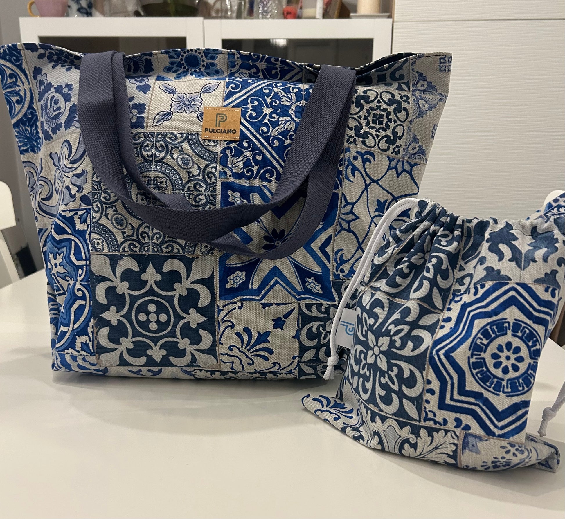 Small tote bag with matching drawstring bag.